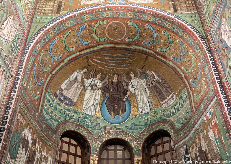 Ravenna is home to one of the world’s best collections of in-situ Byzantine mosaics. The sixth-century Basilica of San Vitale has some of the city’s best. Heineicke and Bowen modeled the lobby of the Woolworth Building on Ravenna’s mosaics, like the Basilica di San Vitale: