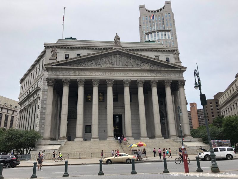 The exterior of the Pantheon served as the inspiration for the New York State Supreme Courthouse, (New York County Court) 60 Centre Street, Low Library at Columbia University, and Gould Library at NYU’s former Bronx campus, and the interior of the Pantheon served as the inspiration for the current Federal Hall at 26 Wall Street.