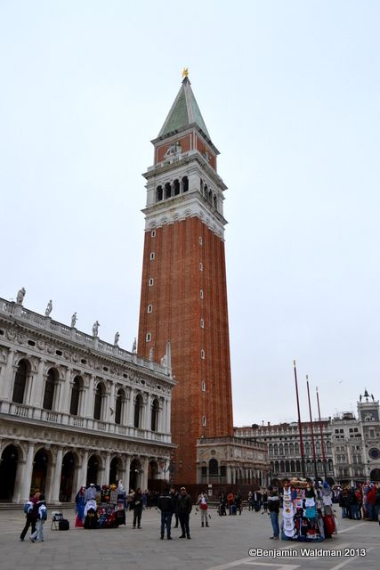Saint Mark’s Campanile is the bell tower of St Mark’s Basilica in Venice. The present campanile was constructed in 1912 and is a recreation of a 1514 one that collapsed in 1902.