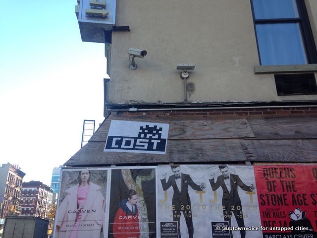 Invader also spoke of his collaboration with Adam Cost and ENX, two NYC-based street artists: “I’m a huge fan of Cost and Revs. I even did a hyperrealistic sculpture of them a few years ago in one of my shows. Last week, I got in touch with Cost and his new partner ENX. In less than one hour, we had the idea to make a “Graffitile” — a graffiti made of tiles — and the day after we did it!” Many of his “invasions” in SoHo and Chinatown have wheat-paste posters of COST & ENX nearby.