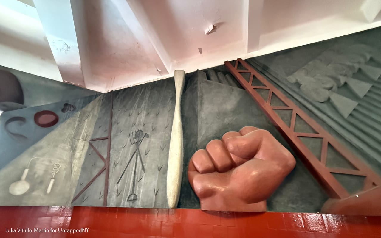 Despite his profound sympathy for the struggles of the working classes, Noguchi himself became uncomfortable with his use of obvious symbolism, for example the huge red fist of labor in the center. But in an interview at the time with the publication, New Masses, he said aspirationally, "Capitalism everywhere struggles with inevitable death—all the machinery of war, coercion, and bigotry are as smoke from the fire. Labor awakens with the red flag. And youth, through education, will see the world creatively more abundant, with equal opportunity for all."