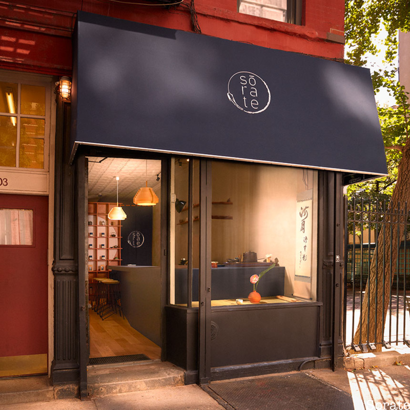 Sōrate is located at 103 Sullivan Street inside an early 20th-century building. The interior design by Venezia-based Studio Architecture Amaa blends contemporary aesthetics with historic details, such as the original tin ceiling. The cozy space is swathed in serene neutral tones and natural materials like wood and stone. A long counter runs the length of the space with room for just four patrons. This limited capacity allows for meaningful interactions and personalized attention. The overall effect is a warm and inviting atmosphere that beckons you inside from the large storefront window.