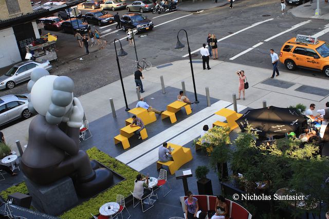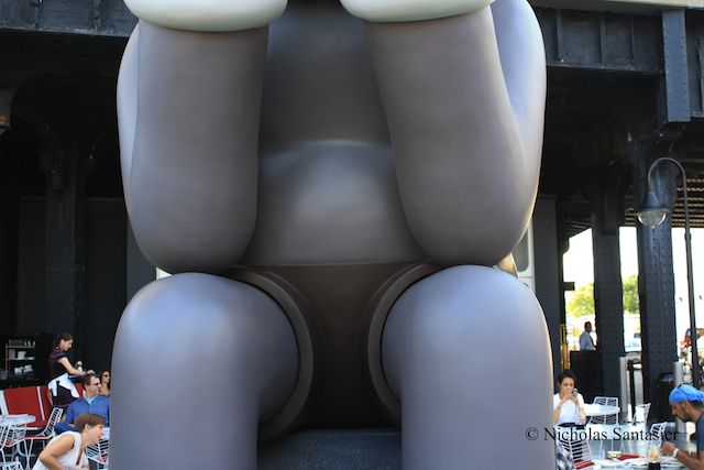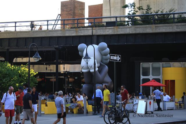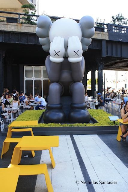 With the summer heat soon coming to a close, everyone seems to be flocking to the High Line to experience its gardens and views of the surrounding the city. I was no exception. All along the way are numerous apartment complexes, churches, warehouses, restaurants, and residencies. However, one thing in particular stood out from all the sights. Right before the staircase to Bloomfield St. at the corner of 13th St and Greenwich St., there is a giant cartoon character sitting in the north section of the beer garden directly below the High Line in front of The Standard hotel.