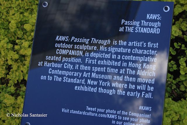 The piece is the artist KAWS’s signature character “Companion,” and here it has the subtitle “Passing Through” since it has traveled all the way from Hong Kong with numerous stops along the way. It will stay in front of The Standard, New York through October 2011.