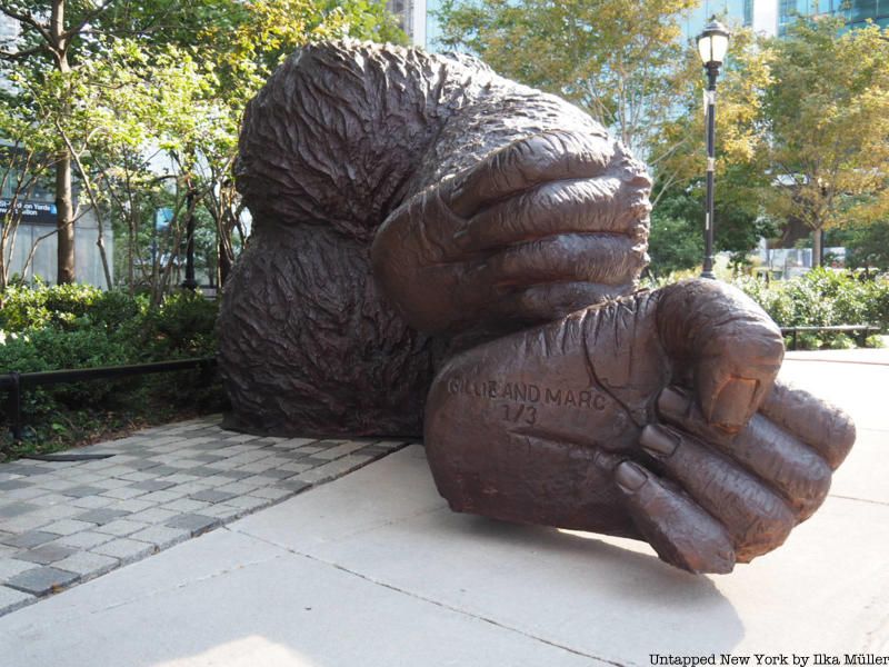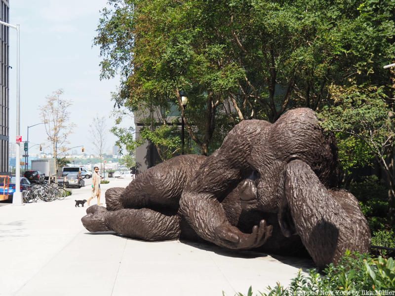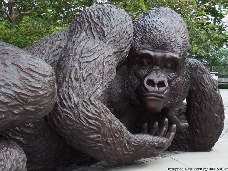 The largest bronze gorilla statue in the world has arrived to New York. This morning, King Nyani (swahili for gorilla) by the artists Gillie and Marc Schattner was unveiled in Bella Abzug Park at Hudson Yards. The statue is designed to raise awareness about the endangered mountain gorilla species, of which only around 1000 remain worldwide, and to change the perception of gorillas among New Yorkers. Instead of terrorizing New York City atop the Empire State Building, this gorilla will be giving out free hugs to any willing New Yorkers. In fact, its giant hands are designed to hold 2 to 3 people at a time.
