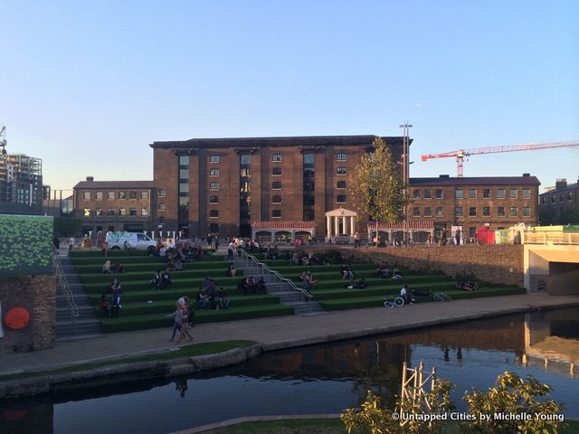 In fact, 40% of the new development is open space but it’s not just from dedicated, stand alone park spaces. Green space will be interwoven between interstitial post-industrial spaces. Some examples: a stepped area at the canal becomes a public space and amphitheater for the art students of Central Saint Martins and University of Arts London, who have already moved in to their new home in a former granary complex. A new park will get built in and around a restored gas holder, 25 meters high. Roof gardens will be on top of gas holders, a nature reserve will be built on the banks of the canal, and a community garden run by local youth supplies local restaurants.