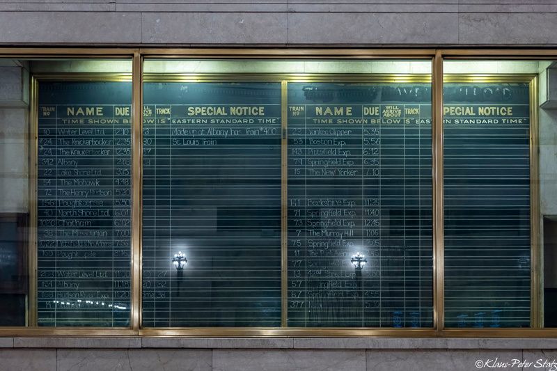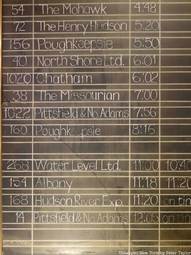 The writing you see on the board today reflects trains that were running in the 1960s, but the writing was redone in 1985 when the Biltmore Room underwent a renovation. You can see the initials and date on the bottom left-hand corner, “S.G.B. 3/20/85.” In 2019, Grand Central’s vintage-looking departure boards went digital.