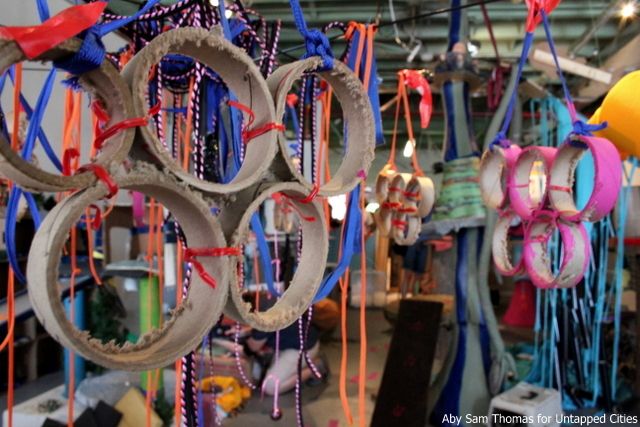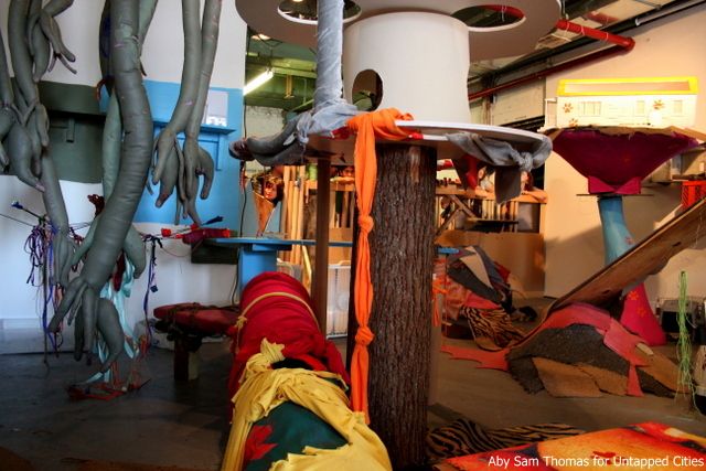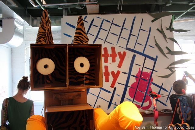 Christina Vassalo, executive director of Flux Factory, said that Kitty City was the end result of a process that paired kids with architects, urban designers, artists and educators to build a model city for felines. These workshops gave kids the opportunity to think about their own communities and urban planning, and then develop those ideas into a practical, yet extremely creative, installation. The level of detail was particularly noteworthy—from fabric patterns to intertwined sculptures, Kitty City had it all. (The hanging vine-like creation at the corner evoked memories of Japanese artist Yayoi Kusama’s famous protrusions.)
