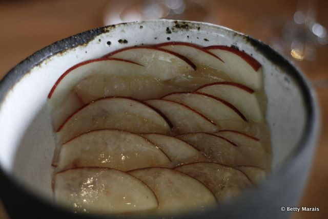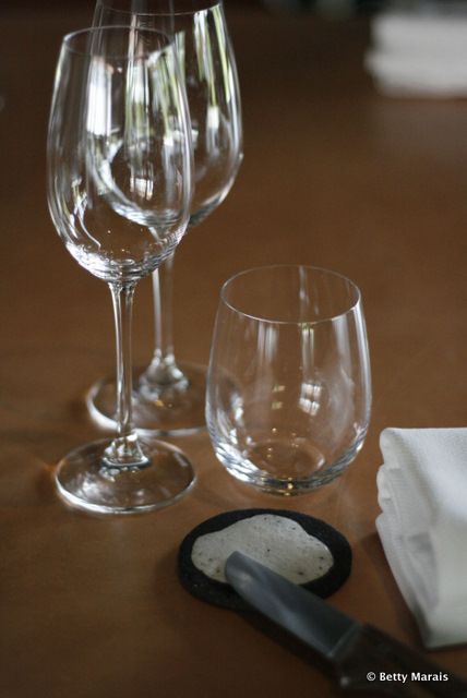 Puis le choc. Un chapiteau de métal, une hauteur sous plafond vertigineuse, une faà§ade de baies vitrées qui nous plonge au cà…“ur de la nature. Nous sommes dans l’antre d’Alexandre. Une cuisine ouverte, à peine dissimulée d’une cotte de maille, et un couloir sombre avec de minuscules meurtrières attise notre cà´té voyeur et nous voilà épiant la brigade.