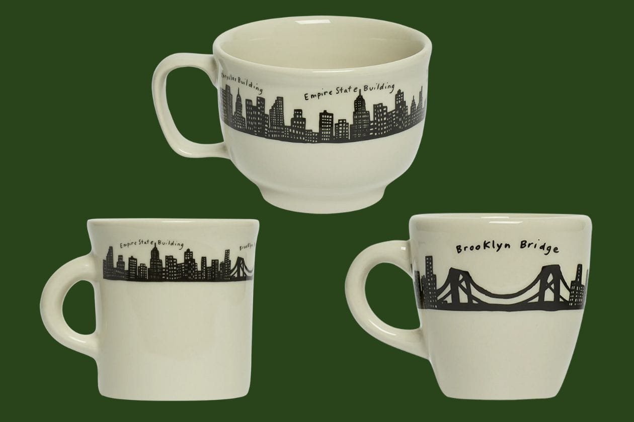 The 212 Skyline collection is an original pattern created for Fishs Eddy, a quirky dish store that's been around for 40 years! These stoneware mugs feature a ring of NYC landmarks from the Flatiron Building to the Brooklyn Bridge. They come in three different shapes and sizes: a demitasse espresso cup, a diner mug, and a jumbo mug to fill with your giftee's favorite caffeinated beverage.