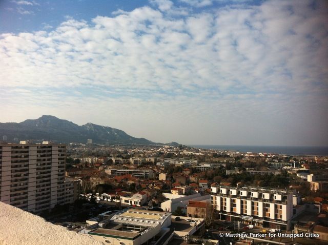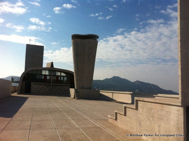 Having heard all about his plans for Le Corbusier’s rooftop, I took to the roof one morning to see what all the fuss was about. Though at first glance there wasn’t much happening, I quickly came to appreciate the extraordinary potential of this place. Stretched out like a ship’s deck, the roof provides panoramic the views of the city—itself ringed by mountains that tumble down spectacularly into the Mediterranean. The unconventional curves of the chimney stacks add an eccentric charm, the architecture making the space unpredictable, playful. It will provide the perfect setting when in June people will ascend skywards to see this special place reborn, giving Marseille a new creative space that will no doubt grab the headlines as much for its art as for its unique setting.