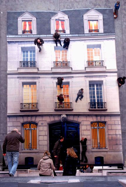 All Parisians, little and big, want this picture where they pretend to climb up a building, tumble down the gray rooftop and hang off an iron balcony with their feet facing the sky and their head reaching for the ground. This partly explains the success of Argentine artist Leandro Erlich’s re-construction of Bâtiment at Centquatre, as part of its In_Perceptions collective exhibition, in September 2011. Originally created for Paris Nuit Blanche 2004, this monumental and vertiginous installation plays on the effects of a gigantic mirror which gives a truly exhilarating feeling of hanging off a four-story building, while safely lying on the ground.