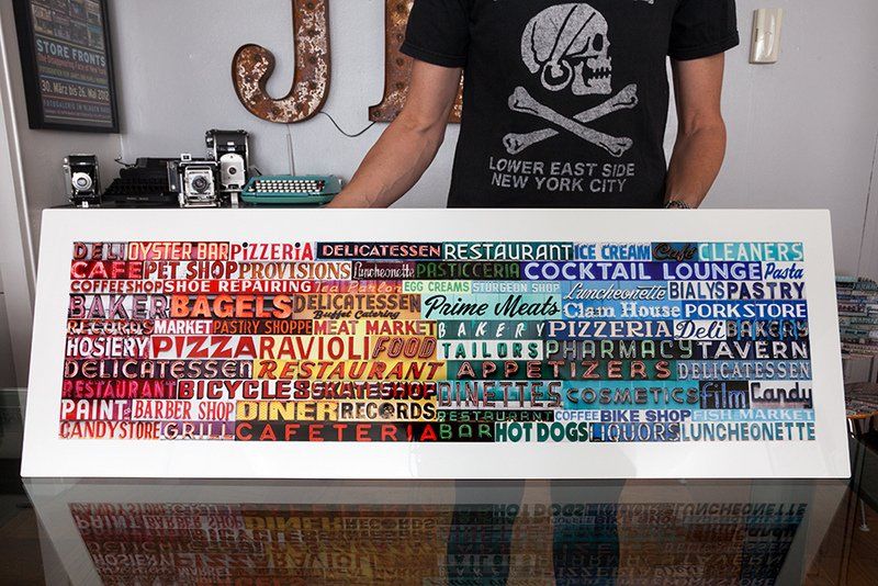 The photos on the 8 foot high x 12 foot tall x 8 foot deep are intended to be representative of the “small businesses that were common in the Lower East Side and helped bring the community together through people’s daily interactions,” say the artists.