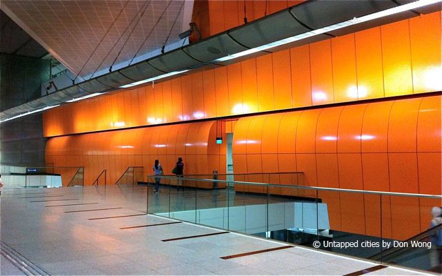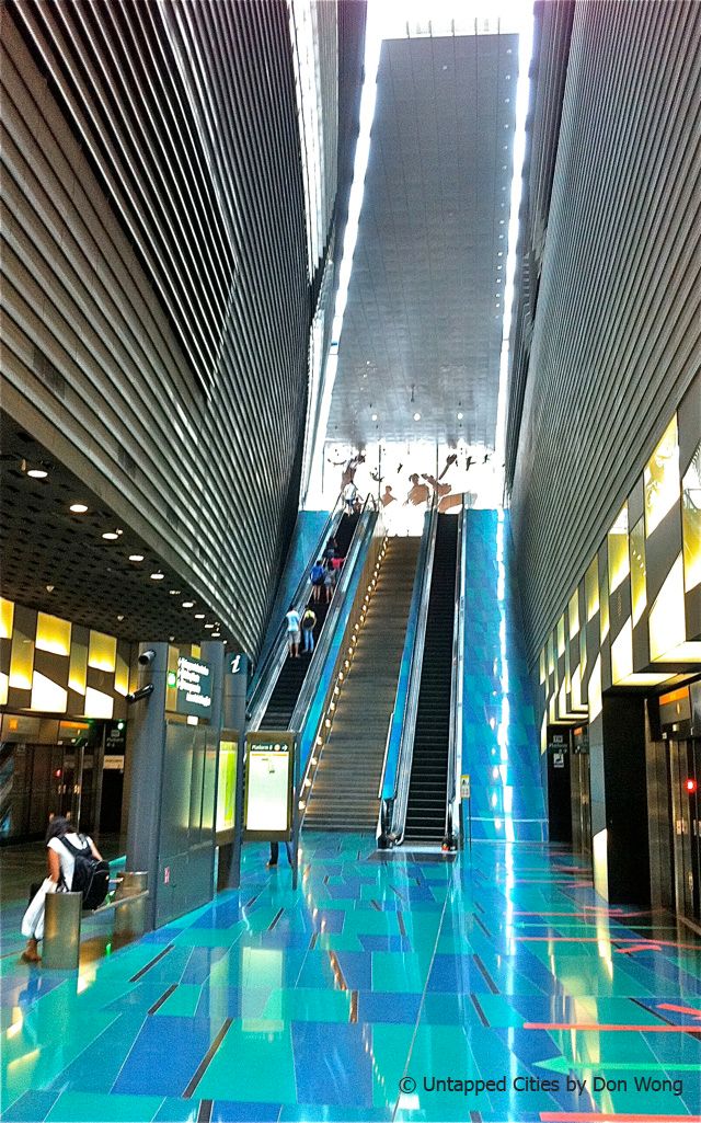 Perhaps not unexpectedly, Singapore’s history can be read through it metro network. The oldest segment of the network is the North-South/East West conduit, shaped like an inverted “T” . These were the 1980s pioneers, built upon principles of pragmatism and functionalism. The stations are generally indistinguishable from each other except for color: Green for Buena Vista, Red for Red Hill etc., and renovations have retained the emphasis on color and simple geometric adornments.