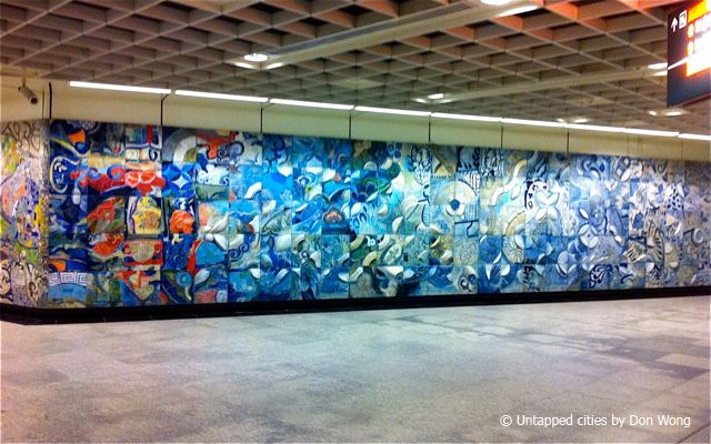 Dhoby Ghaut is etymologically probably one of the most interesting stations in Singapore, derived from the Hindi word ‘Dhobi Ghat’ which refers to a public washing place, usually a river-bank, where Dhobis (washer-women) do their laundry. We recall more than once being asked by Indian visitors why Singapore as a modern city still had a national ‘Dhobi Ghat’! The station is best known for its signature mosaic mural, designed by Romanian-Yugoslavic pair Prvacki and Milenko in 2001 as a tapestry of Singapore’s multicultural history.