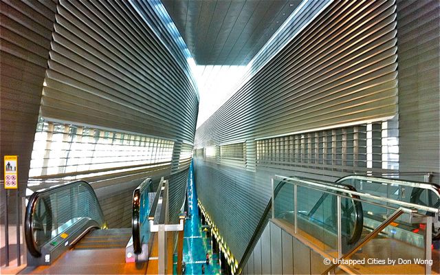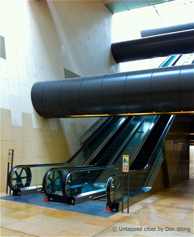 At 35m, it is the deepest station in the network, and the design by architectural firm WOHA emphasizes its cavernous nature by interplaying dark granite against white sunlight. A passenger literally experiences the passage from ‘dark’ to ‘light’ through a series of dramatic escalators, also the longest in the metro network.