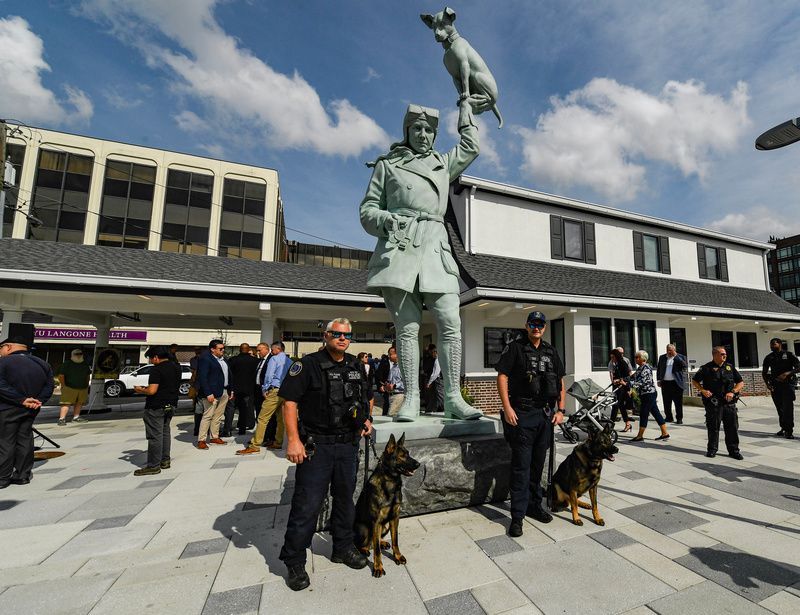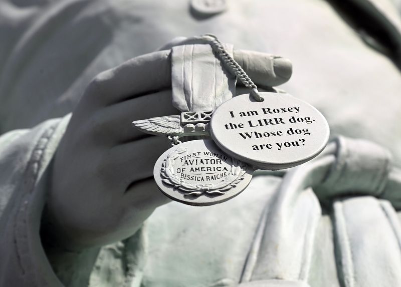 A dog who rode the rails of the Long Island Rail Road and the first female to pilot an airplane solo may seem like an unlikely pair, but they are joined together in a new sculpture by artist Donald Lipski at the upgraded Mineola train station. The sculpture, titled Bessie and Roxey, depicts aviator Bessica (Bessie) Raiche and Roxey, the unofficial canine mascot of the LIRR. Though the two never interacted in life, they both are intricately tied to the history of Mineola and the railroad. Their stories were remembered when the renovated station celebrated its 100th anniversary this September.