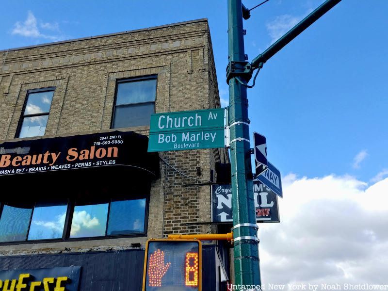 Since 2006, a stretch of Church Avenue in East Flatbush was given the name Bob Marley Boulevard. Honoring the legendary reggae artist, Bob Marley Boulevard passes through the center of Little Caribbean on Nostrand Avenue before extending east. At its intersection with Nostrand Avenue is a popular Jamaican spot called Exquisite Express, a few doors down from another food spot called Caribbean Vibes. To the east of the Church Avenue station are a handful of eateries including Little Haiti, Tastee Pattee, and Trini Breakfast Shed.