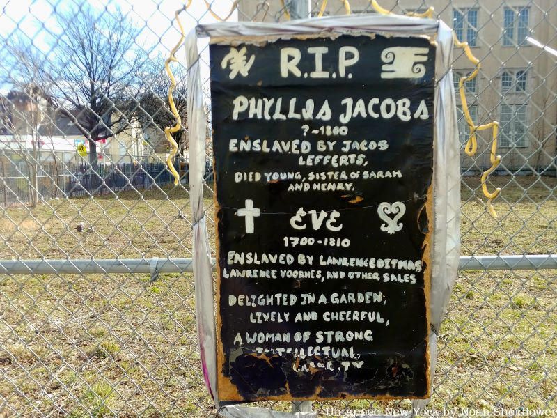 A sign on the outside gate of the burial ground honors Phyllis Jacobs, born around 1785, who was enslaved by Jacob Lefferts and died around 1800. Another woman known as Eve, who was said to have lived to the age of 110, from 1700 to 1810, was enslaved by Lawrence Ditmas, Lawrence Voorhes, and others. She was described as “lively and cheerful, a woman of strong intellectual capacity” who was “delighted in a garden,” according to the sign.