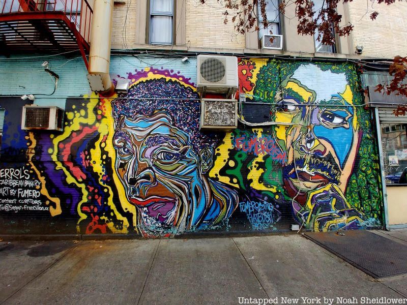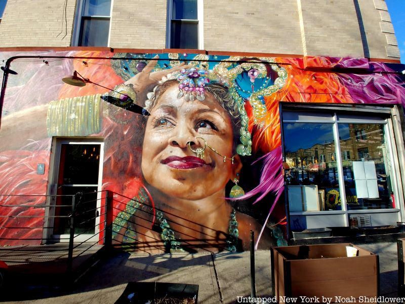 By Errol’s Caribbean Bakery on Hawthorne Street and Flatbush Avenue is a mural by Fumero depicting Bob Marley and James Baldwin with vivid blues. Errol’s is known for its beef patties, chicken soup, oxtail, and currant rolls. Artist Damien Mitchell depicted a woman wearing a jeweled headpiece, with feathers and gold bangles in his mural outside Zanmi. The mural takes inspiration from Crown Heights’ West Indian Day Parade, fittingly displayed outside the Haitian restaurant known for dishes like balsamic Kreyol scallops, Pâté Kode, and their plantain submarine.