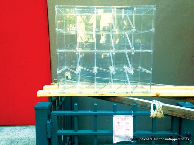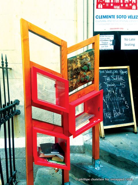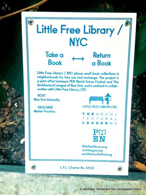 Little Free Libraries that have popped up around Manhattan.These libraries run on the good will of the people. Started in Wisconsin in 2009, they currently have over 5,000 locations in the country and worldwide. This project was brought to NYC through the PEN World Voices Festival and the Architectural League of New York. They come to the city as part of many exhibits in the IDEAS City Festival, and will be open until September 1, 2013 when they will each be evaluated for their longevity. As you can see in the photos below, many of the locations unfortunately suffer from barren bookshelves.