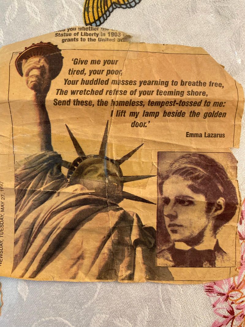 As we spoke, Carol was surrounded by stacks of photos, albums, newspaper clippings, and Statue of Liberty memorabilia that her father had collected throughout the years. She excitedly showed us everything from a collective teacup and saucer set to an actual metal piece of the statue. Among the ephemera, there were also letters written in squiggly crayon writing. She used to travel around to her grandchildren’s classrooms to tell her story of life with Lady Liberty and in return, she’s received dozens of handmade thank-you notes from the schoolchildren.