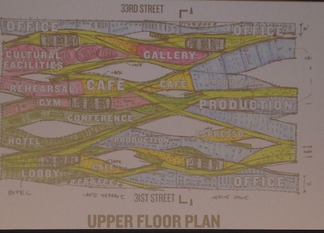 High speed rail systems are progressing in the US. “We’ve been working on developing a public-private partnership strategy to promote the redevelopment of Union Station.” He wants the project to include an opportunity to connect with the community and create dynamic spaces like the green roof he is developing. For example, Mayor of Annaheim, CA wanted to create an iconic building. He looked at blimp hangers as a model, and created a transparent building that is a high-speed rail connection node. “With train stations the key is to create commuter retail.” He explores different plans for moving Madison Square Garden and how the area will be developed after MSG if removed. How would they improve circulation among different commuter lines? “We all know that we need a new gateway, a new iconic element, a new sense of arrival to NYC.” He believes MSG must move to accomplish this.