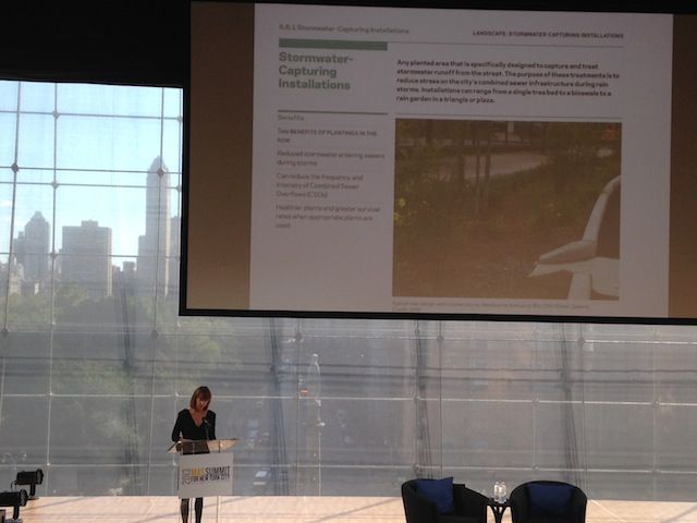 Street Design Manual 2013 by the NYC DOT: Incorporates new designs in the DNA of how the city does business. Starts with designing the surface of the street. Looks at how to take a dangerous street and make it a safety-design success story. On Cobblestones: “They flood, can’t bike on them, you trip on them… so we’re looking at pre-tumbled more worn down cobblestones as an alternative.” The manual also looks at pedestrian safety islands. Looks at new City Light Fixture. CityBench “for posterity and posteriors”, NYC is not a sittable city, so they’re adding a thousand benches across the city. They have guidance in the manual also for public artwork. They also have a playbook for City Rack (Bike racks). They also have a new section on landscape improvements which she sees as crucial heading into climate change. They look at capturing and treating rainwater runoff.