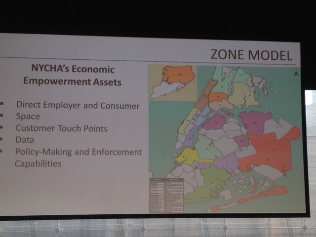 “NYCHA is a city within a city. We serve half a million NYers… NYCHA really contributes to the economic backbone of NYC…. but there’s low participation in services that help people get into the workforce.” NYCHA has shrinking resources and so the agency has started thinking about how to leverage non-financial assets.