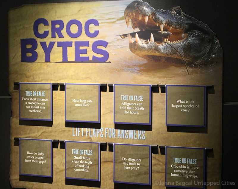 In “Crocs,” museum visitors can experience a number of interactive crocodile-themed exhibits. One installation called “Croc Talk” says that crocodiles begin vocalizing when they are still in their eggs. Visitors can press a button and learn what different crocodile noises mean, including mating calls of different species and sounds they make when they are in danger. There is an exhibit that explains the key differences between crocodiles and alligators, video explainers and crocodile trivia.