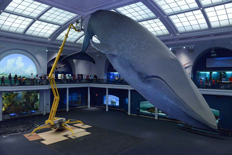 In 2003, the Milstein Hall of Ocean Life was reopened following a $25 million renovation, which included a rehabilitation of the whale to make it “more anatomically accurate than before,” says the museum. In the last fifty years, many more resources have become available for the study of the blue whale. As a result, the blue whale model at the American Museum of Natural History had a bit of a makeover: the eyes were made less bulging, the blowholes more true to nature, and made the tail more tapered. It also got a new paint job – which required 25 gallons of paint.