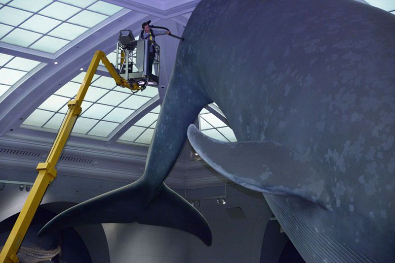 It’s that time of year again: the enormous blue whale at the American Museum of Natural History is getting its annual wash down — and we were there to live-stream the event, which took place earlier today inside the Irma and Paul Milstein Family Hall of Ocean Life. Wielding long-handled brushes and vacuums, Exhibition Department staff meticulously cleared dust and dirt off the iconic life-sized model, which was constructed based off of photographs of a dead female blue whale that was found off the coast of South America’s most southern point in 1925.
