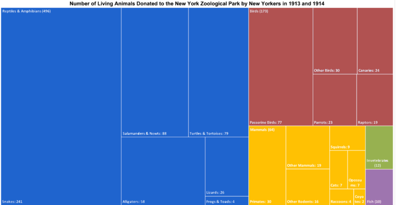 In total, New Yorkers gave the zoo 785 living animals in 1913 and 1914. Most were small creatures, such as local snakes, young alligators purchased from pet stores, and songbirds, which were relatively easy to find and transport to the park. The large number of snakes donated might be due in part to the zoo’s willingness to accept them (they used them for new exhibits and as food for snake-eating snakes), and by some people’s enthusiasm for catching them, spurred on by Ditmars’ guide to New York City snakes. Head to the Gotham Center blog to see an interactive map that plots the addresses of all of the people who gave living gifts to the Bronx Zoo in 1913 and 1914.