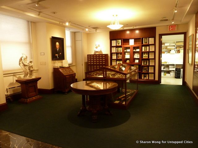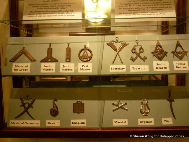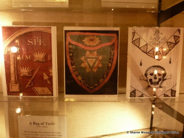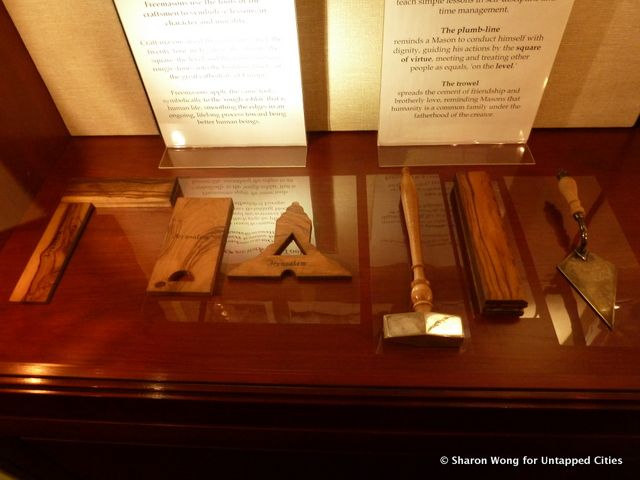 The Livingston Masonic Library is a classically beautiful space located on the 14th floor of Masonic Hall on West 23rd St. It is as much a repository for relics as for books, containing cases full of beautiful objects, each wielding their own special significance. Some of the most iconic are the building tools, symbols of the group’s possible beginnings among the guilds of stonemasons during the Middle Ages.