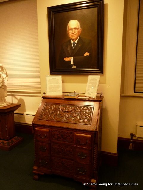 Savini told us that Freemasonry evolved from a desire among the bourgeoisie to form a group of enlightened, civilized individuals, so taking genteel repast after gatherings was certainly not unheard of. Another special artifact at the Livingston Masonic Library is the desk of Norman Peale, author of The Power of Positive Thinking.