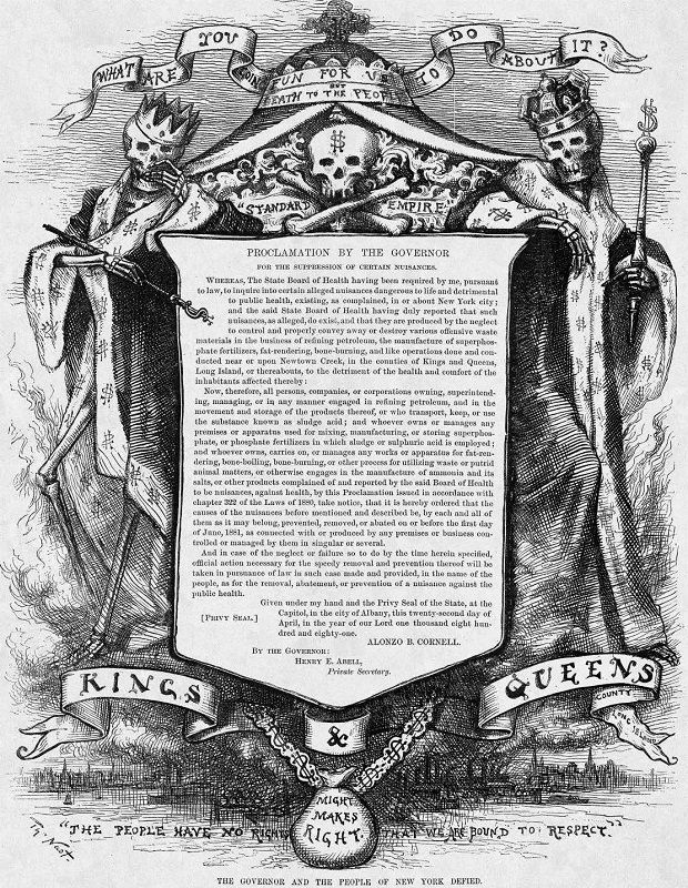 The proclamation’s June deadline passed and, as the New York Tribune observed, the Newtown Creek industries “stoutly disregarded it.” Harper’s Weekly, a leading national magazine, then picked up the cause in August and ran a series of articles and editorials harshly attacking the Newtown Creek companies, including Standard Oil. The magazine and its political cartoonists, including Thomas Nast, portrayed the businesses as arrogant merchants of death who enjoyed “fun for us” but brought “death to the people.”