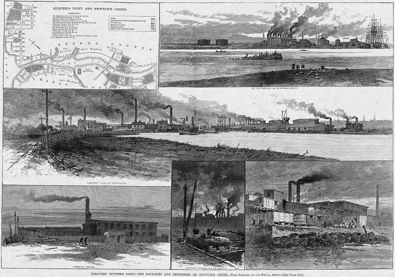 Once an ecologically rich waterway, around the time of the Civil War heavy industrial uses sprang up along Newtown Creek. The neighborhood along the north bank of the creek, Hunter’s Point, became synonymous with oil as several refineries were established there. By 1881, the area was also known for its foul stench and the release of sludge acid and other wastes into the waterway by the refineries and other businesses.