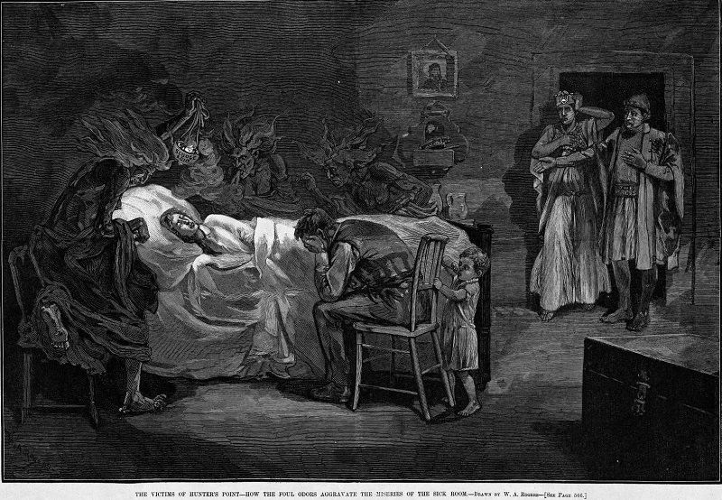 As shown in the cartoon above, Harper’s Weekly focused not only on the effects on Newtown Creek but on the air pollution that impacted health in surrounding areas including Manhattan’s East Side. The editorials called the businesses of Newtown Creek ” brutal bullies” who “poison the air which a large part of the city breathes.” “He who injures or annoys hundreds of thousands of his fellow-citizens will deserve and receive his punishment,” the magazine wrote, “as certainly as the ruffian who robs or kills the few.”