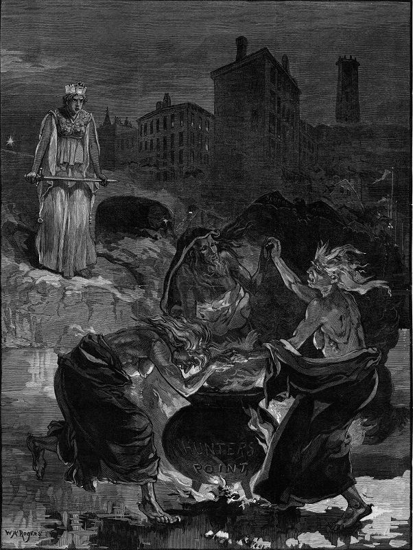 Another Harper’s Weekly cartoon, shown above, “Death Cauldron at Hunter’s Point” by W.A. Rogers, features demonic figures around the Hunter’s Point cauldron with sludge acid, embodied in a bat, hovering above. In a 21st-century echo of this hellish imagery, Mitch Waxman, who leads tours of Newtown Creek, refers to it as the “Poison Cauldron.”