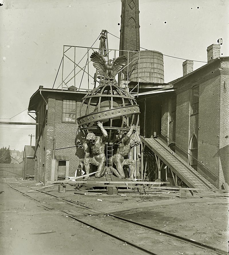 Completed in 1898, the building’s piece de resistance was the thirty-three foot tall, eight ton, sculpture on the top of the building. Philip Martiny, who studied under Augustus Saint-Gaudens, designed the work. The piece consisted of four, 11 foot tall, crouching figures of Atlas, on whose shoulders rested a 15 foot diameter hollow globe, which was topped off with a 7-foot-tall eagle.