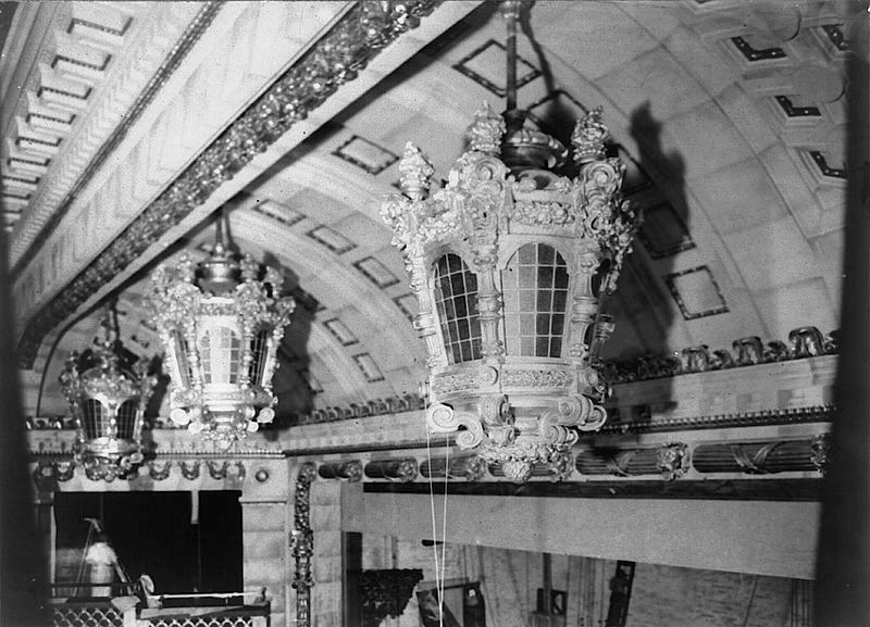 Inside, the most impressive feature of the Roxy was the chandelier which hung above the main auditorium seats. Reported to be the largest light fixture in the world at the time, it weighed six and a half tons, measured 30 feet in diameter, and had four different color settings (amber, red, green, and blu). More than a hundred floodlamps and dozens of spotlights shone from inside the three-tier fixture that was surrounded by relief sculptures of gods and goddesses designed by Rene P. Chambellan with the Italian sculptor Oronzio Maldarelli.