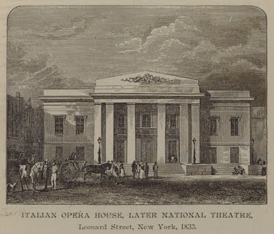 The Italian Opera House was located on the northwest corner of Leonard and Church streets in what we would know today as Tribeca. Architecturally, the Italian Opera House looked akin to a small White House. It was built by Venetian-American Lorenzo de Ponte, who was a Roman Catholic priest and librettist for Mozart. He emigrated to America in the late 1820s, became the first professor of Italian literature at Columbia University, and founded the Italian opera house in 1833, at the age of 84. It was a short-lived venture.