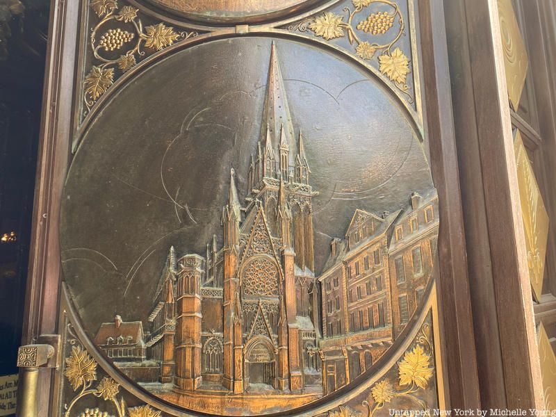 The doors were initially taller and wider and initially featured ten medallions adorned with images of cities in Normandy and the SS Île de France. However, only six of the medallions remain on the door at the main entrance of the Cathedral, as the doors were resized (and seemingly redesigned to compress the spacing, with nature motifs added as well). The other four medallions are now on a smaller set of doors at the Remsen Street entrance of the cathedral.