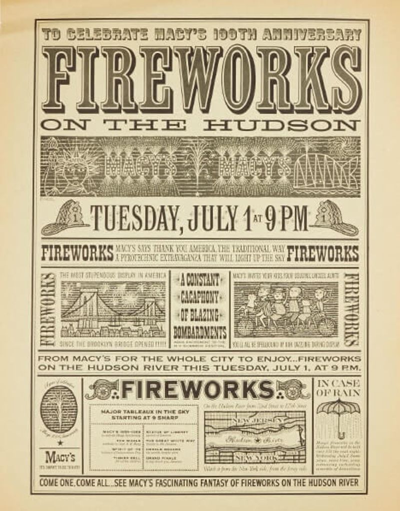Macy’s first-ever fireworks show was a celebration of Macy’s 100th Anniversary, rather than America’s birthday. On July 1st, 1958, over the Hudson River, a million people watched the store’s first-ever large-scale pyrotechnics show. It wasn’t until 1976, in partnership with The Walt Disney Company, that Macy’s 4th of July fireworks shot became an annual tradition. That year, the fireworks were set off in honor of America’s bicentennial. The show was first televised in 1991.