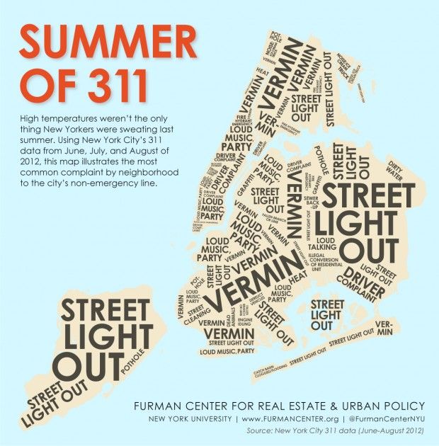 The Furman Center at NYU released this fun map of 311 complaints from last summer, based on data of the most popular complaint by neighborhood. The top complaints were: