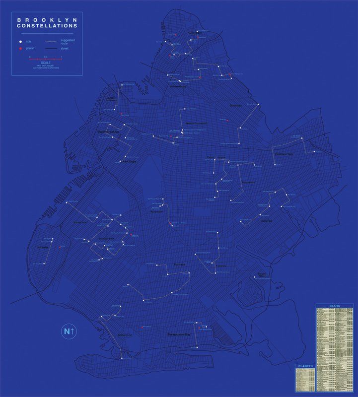 Brooklyn artist Katarina Jerinic created here a map of the astronomy of Brooklyn using the Yellow Pages. The white dots are stars, the red dots planets, and the dotted lines are street routes that create constellations. Some star and planet names include Star Cits, Star Sporting Goods, Star Deli, Planet Brooklyn Music, Star Self-Service, and Planet Kidz Fulton. Quirky but beautiful, it paints the picture of a calm Brooklyn that can be admired from afar.