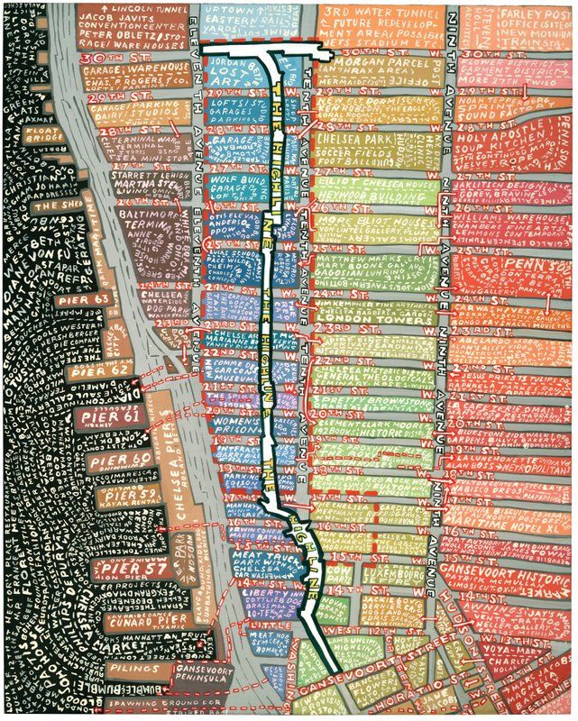 Manhattan’s High Line has become one of the city’s most popular attractions, visited by five million people each year. When James Corners design was chosen for this railway, Paula Scher of Pentagon Designs became involved with the efforts to bring this wonderful design to life, including designing the logo and overseeing promotional materials. The map above was created by Scher as a fundraising poster.