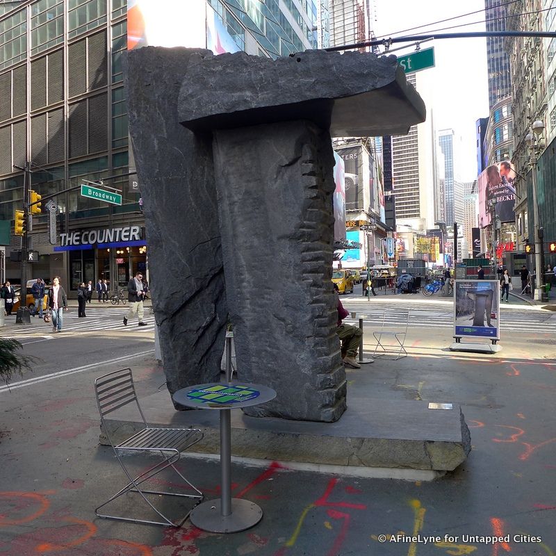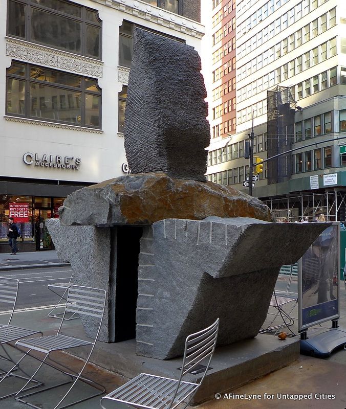 Snaphance, 2011, black granite 8′ x 8′ x 6′, located on Broadway between 39th and 38th Streets