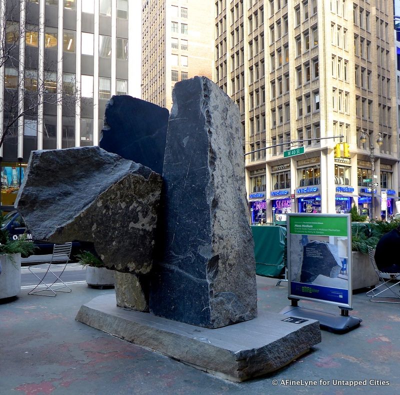 Each piece was artfully assembled into five stone sculptures. The choice of medium granite, was a good choice, since Manhattan is largely a protrusion of this rock, rising a few hundred feet from sea-level. Beginning at 41st Street moving south to 36th street, below are the five sculptures that make up the installation Mass Medium.