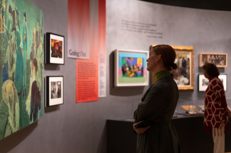 The second section of This Is New York, named “Destination NYC,” pays homage to the many artistic representations of places in New York City. Everywhere from iconic sites like Times Square and Central Park, to miscellaneous restaurants, dance clubs, and beaches are represented. These familiar places appear in a collage by Romare Bearden called Jammin’ at the Savoy, in a story quilt by Faith Ringgold called Tar Beach which depicts a Harlem rooftop, and in paintings like Salman Toor’s Bar Boy which illustrates a scene at a queer bar.